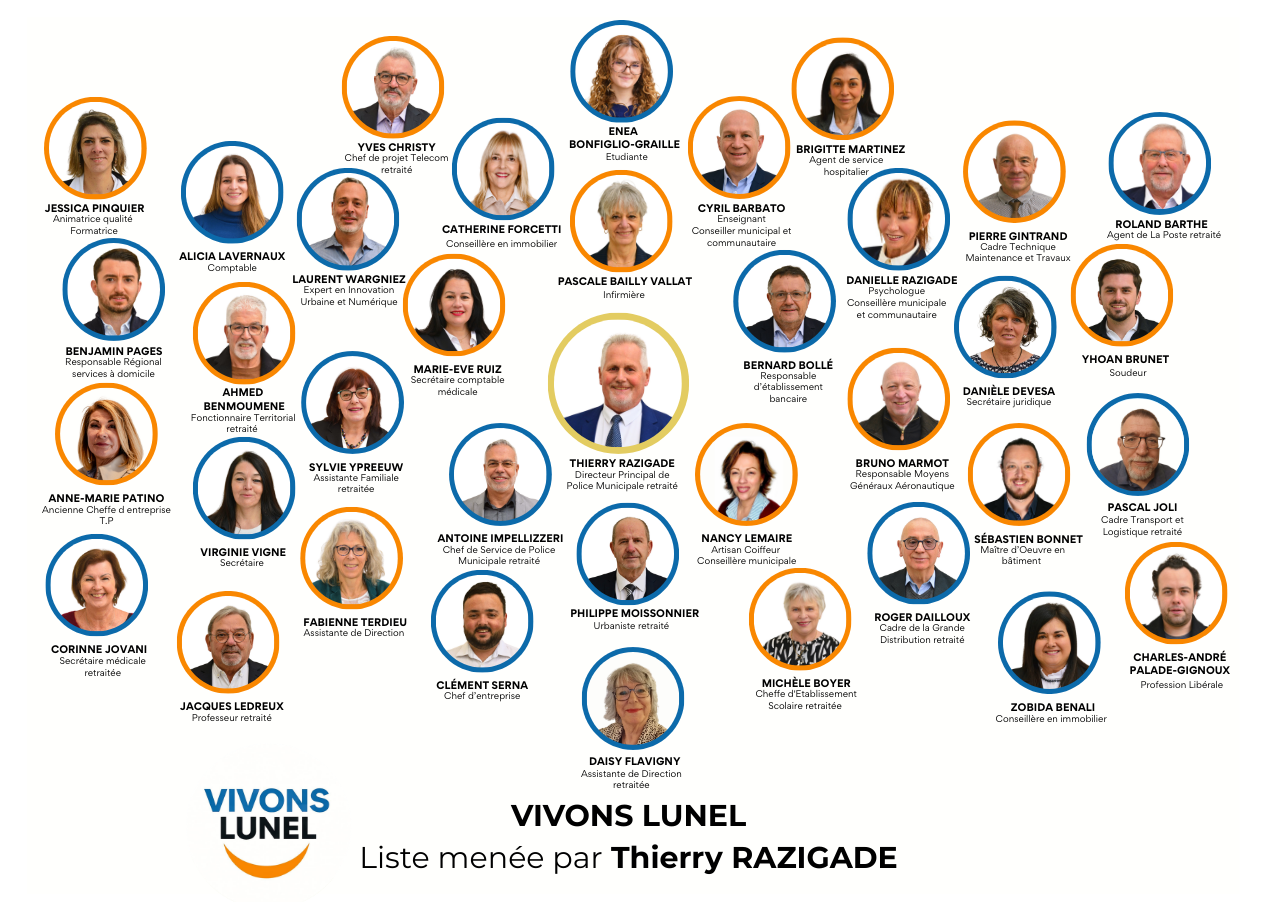 Une liste ancrée à Lunel, au service de l’intérêt général La liste Vivons Lunel est composée exclusivement de Lunelloises et de Lunellois. Des femmes et des hommes qui vivent ici, connaissent leur ville et s’y